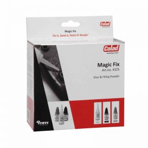 Magic Fix se veut ultra performante, ce produit de la marque Colad est une colle à combiner avec une poudre de renforcement noire et grise. Si le diagnostique n’exclut pas une réparation, cette colle permet de réparer, poncer et peindre très facilement et rapidement.