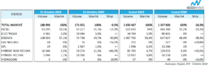 Les immatriculations de véhicules 100% électriques (+129% en octobre) et fait unique plus encore ce mois-ci celles des hybrides rechargeables (+398%) sont venus au soutien du marché. L’arrivée de nouveaux modèles électriques va permettre à certaines marques de combler leurs retards sur leurs objectifs européens en termes d’émission de CO2.