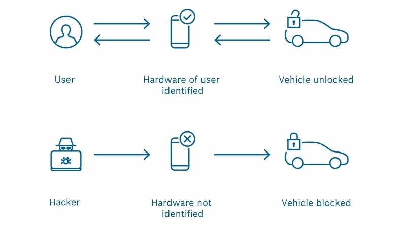 Bosch met aussi à profit ses compétences dans le domaine des semi-conducteurs pour rendre la connexion aussi sûre qu’une empreinte digitale. Chaque smartphone contient en effet de minuscules micropuces qui commandent la communication via Bluetooth. Ces puces jouent un rôle clé dans la solution Bosch. Leur association avec les capteurs installés à bord du véhicule et un calculateur spécial permet d’obtenir un système qui n’ouvre la portière qu’en présence du smartphone dont la clé virtuelle correspond parfaitement à la serrure numérique du système Perfectly keyless. Les signaux en provenance d’autres smartphones ou d’appareils électroniques qui manipulent la transmission radio sont en revanche bloqués. Perfectly keyless protège ainsi des accès non autorisés.
