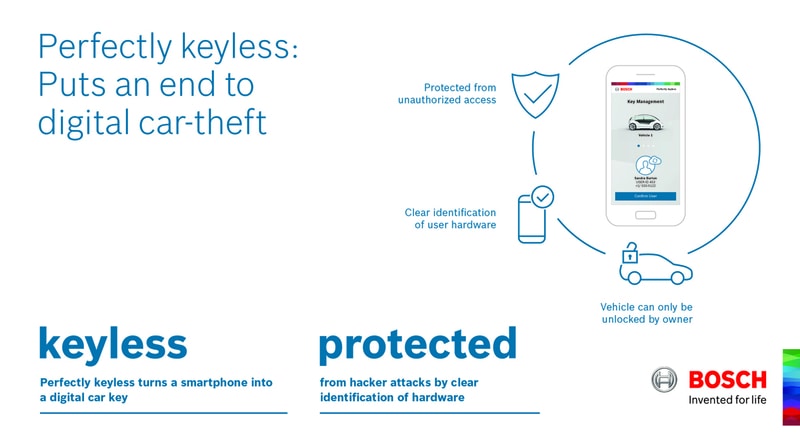 Alors que les systèmes classiques d’accès sans clé nécessitent toujours la présence de la clé de confort dans la poche de l’utilisateur mais pour ouvrir la portière et démarrer le moteur, cette clé communique directement avec la voiture par liaison radio dans la gamme de fréquences LF ou UHF (basses fréquences ou ultra hautes fréquences). Dans la lutte contre le vol, les constructeurs ne cessent de perfectionner ces systèmes. « Avec Perfectly keyless, Bosch s’est lancé dans le développement de systèmes d’accès numériques destinés aux véhicules. Notre devise est la révolution et non l’évolution », poursuit Harald Kröger. Au lieu de transmettre les données via la technologie LF ou UHF, le système Bosch utilise le smartphone comme une clé virtuelle et fait appel à Bluetooth pour la technologie de transmission. Cela signifie que même la clé de confort peut rester à la maison.